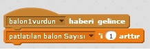 Öncelikle yeşil bayrağa yıklanınca süre 40 saniye olsun. Üste çık komutu ile hedefin balonların üstünde gözükmesini sağlayabiliriz. Hedefimiz sürekli olarak fare oku'nu takip etsin. Böylece faremizi nereye götürürsek hedef resmide o noktaya gidecektir. Şimdi hedef aldığımız balonları patlatmaya vurmaya geldi. Eğer hedefimiz; Balon1'e değdi ve fareye basılı ise Balon1 haberini sal. Bu haber gelince ne yapılacağı yukarıdaki Balon1 kodunun içinde yer almaktadır. Ve bu kontrolü eklediğimiz tüm balonlar için yapıyoruz.
