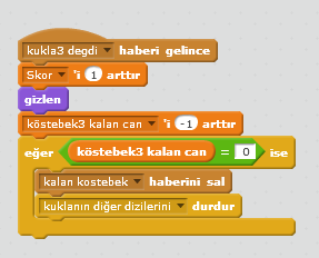 Köstebeklerin kalan canı 0 olduğunda bir haber salıyorlar kalan köstebek diye bu haber o köstebeğin canının bittiğini bize haber veriyor. Daha önce veri menüsünden oluşturduğumuz Avlanan köstebekler değişkeni 1 artıyor. Bizim oyundaki köstebek sayısı 7 olduğu için değişken 7 sayısına eşit olduğu zaman oyun bitmiş oluyor ve her şey duruyor.